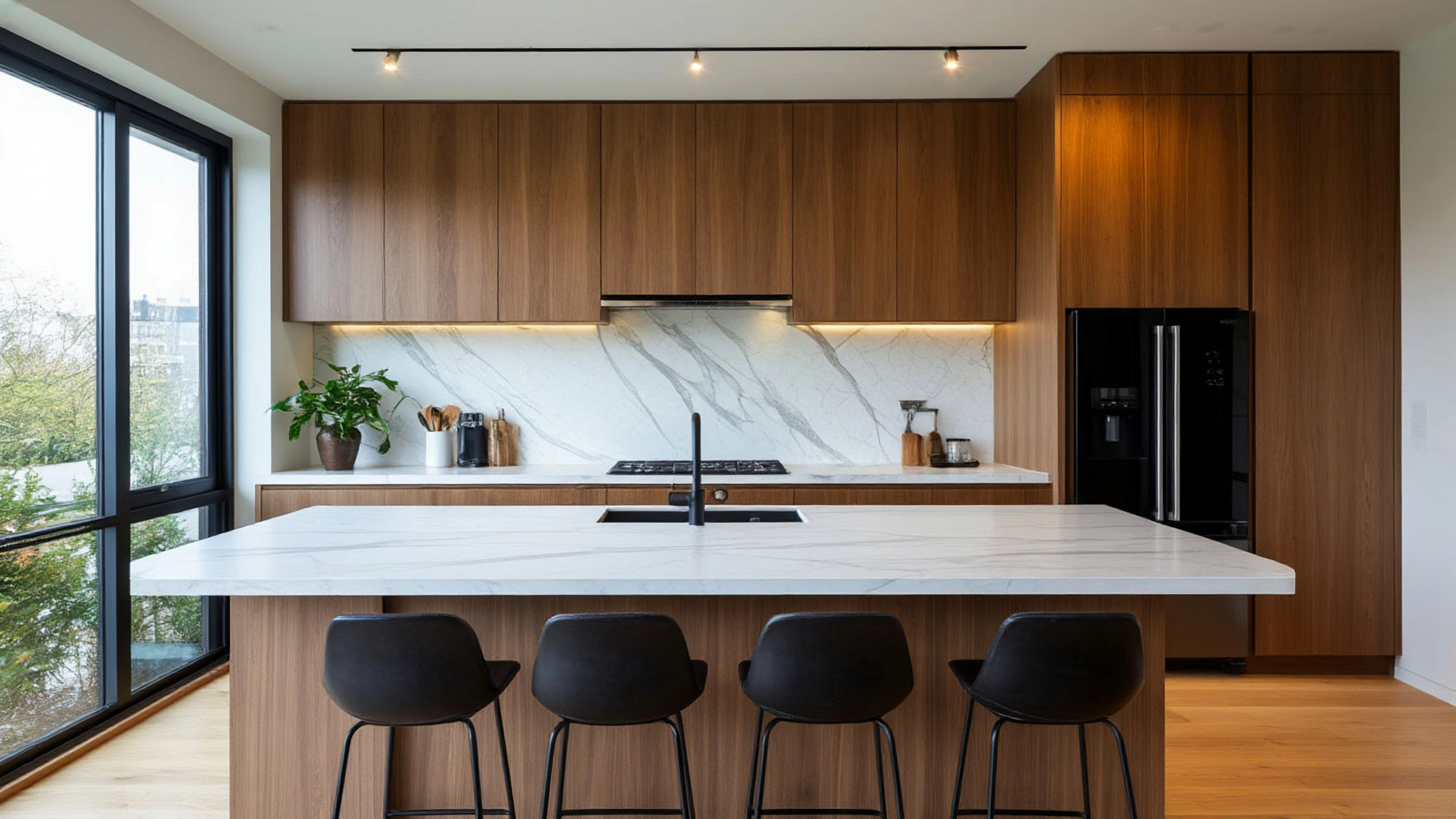 Особое внимание в кухне "Контур" уделено взаимодействию материалов. Гладкие фасады сочетаются с выразительной, но спокойной каменной столешницей светлого оттенка, в которой виден тонкий природный рисунок. Этот контраст между теплым деревом и прохладной каменной поверхностью делает интерьер живым и многослойным, но при этом не перегруженным. Камень добавляет ощущение надежности и основательности, а дерево — уюта и визуального тепла. Вместе они формируют сбалансированную композицию, в которой каждая деталь усиливает другую.