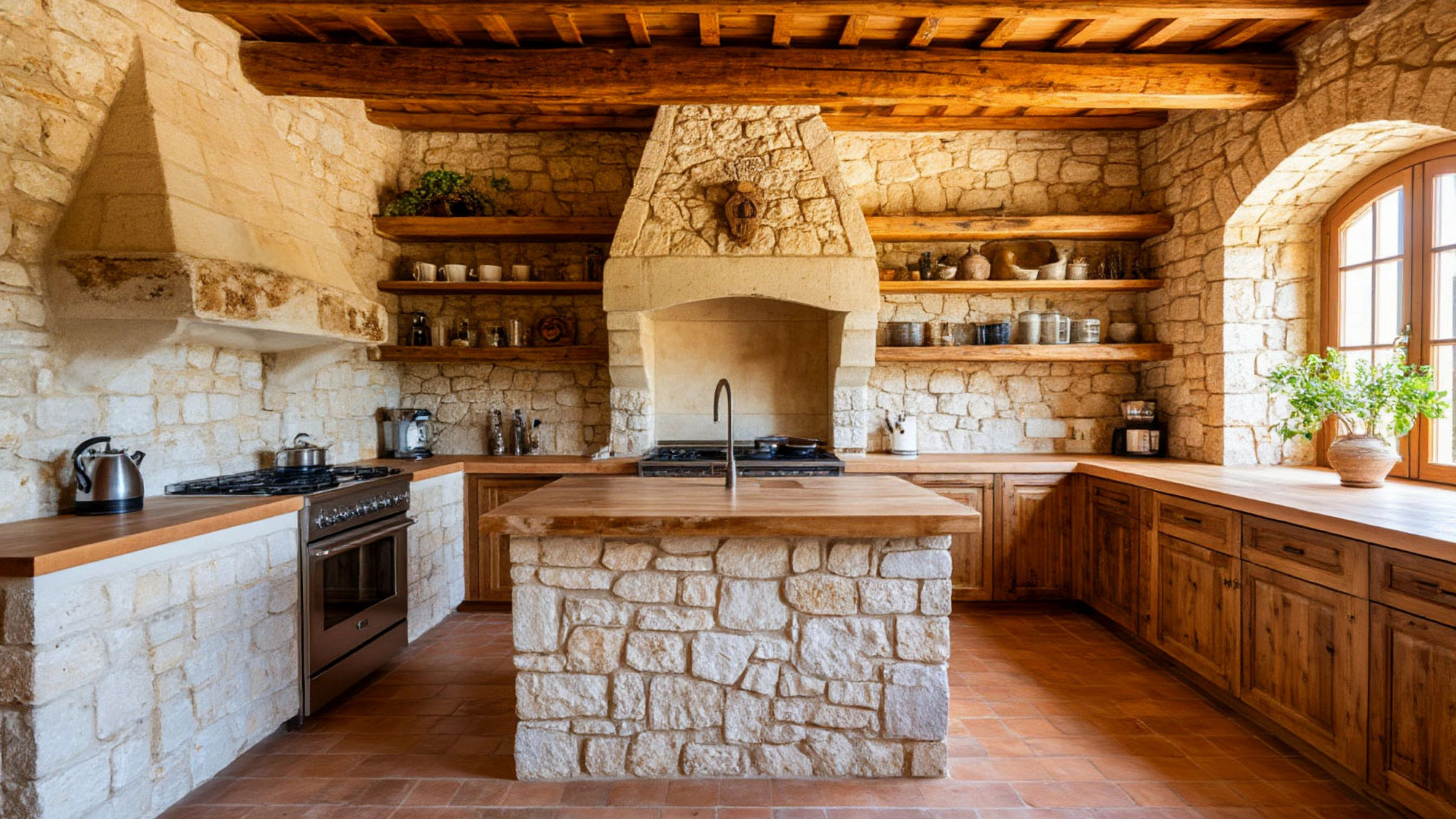Деревянные элементы в "Лигурии" добавляют тепла и живости. Это могут быть открытые полки из дуба, столешницы с мягким золотистым отливом или декоративные панели, которые подчеркивают природную гармонию кухни. Фактура дерева — не идеальная, с естественными волокнами, сучками, тонкими переходами цвета. Она создаёт ощущение подлинности, тепла человеческих рук и связи с землёй. Такое сочетание камня и дерева — основа философии средиземноморского интерьера: природа в доме и дом в гармонии с природой.